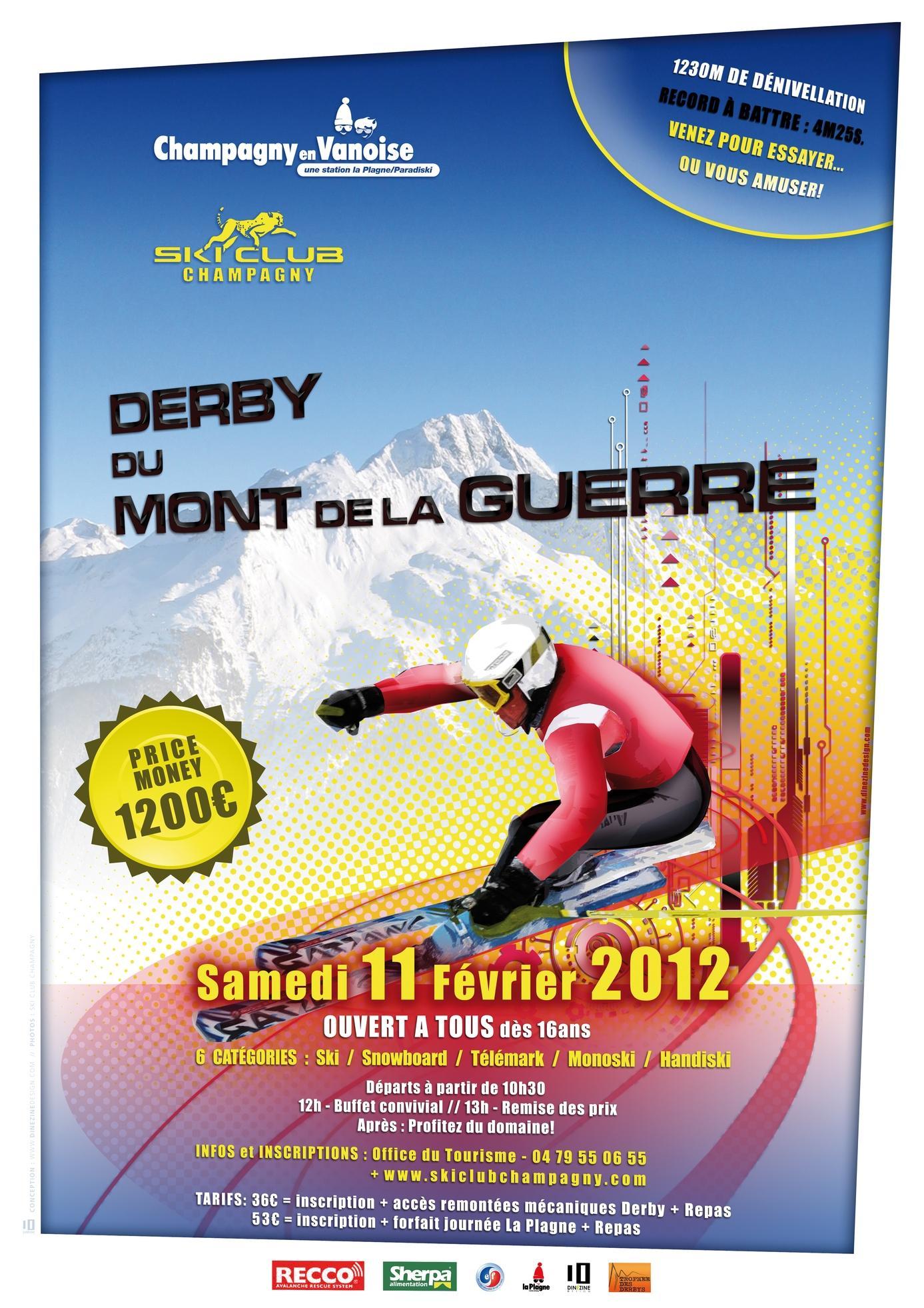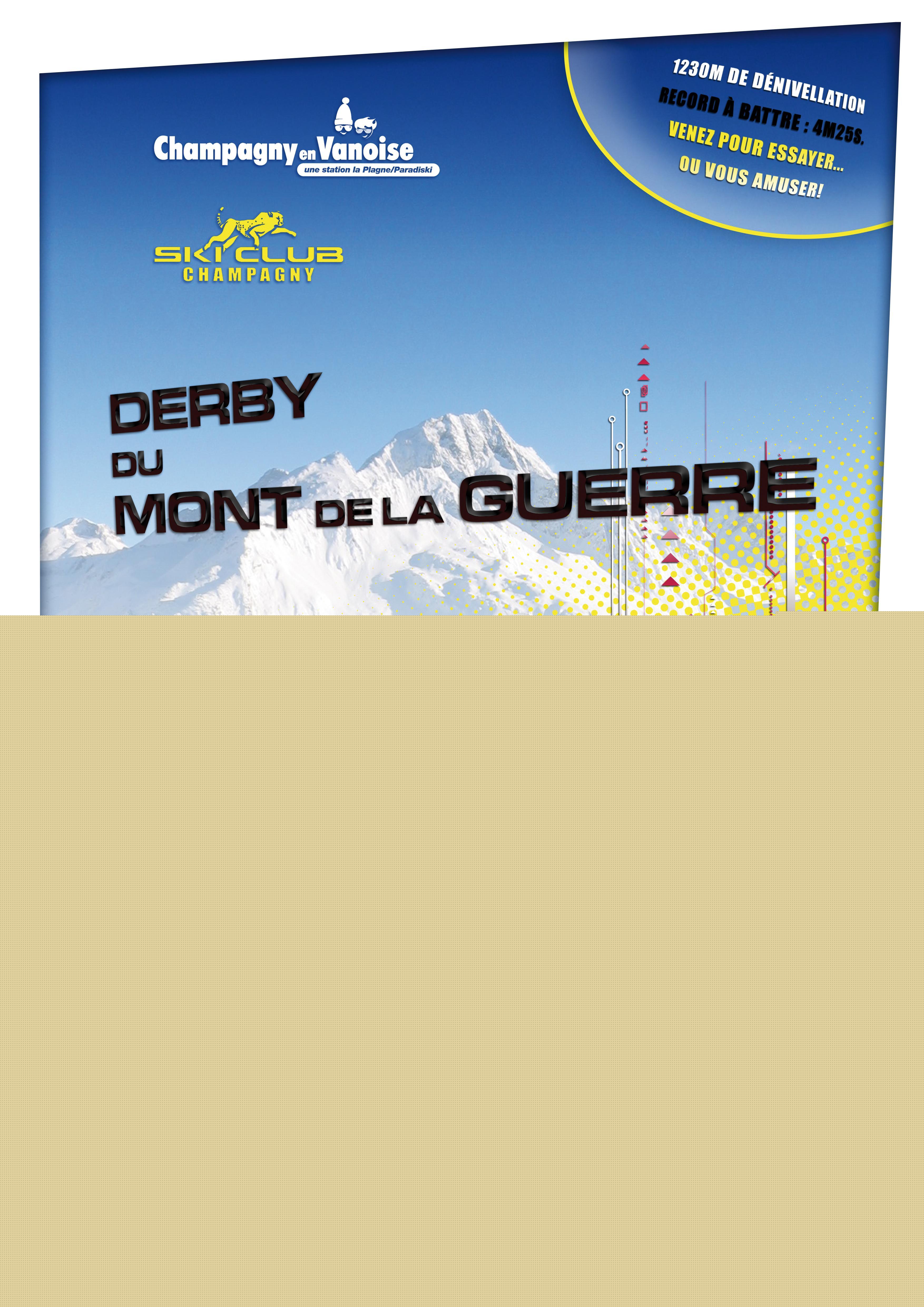 Le Derby du Mont de la Guerre Depuis des temps immémoriaux le Mont de la Guerre (Sommetdédié aux dieux) a développé legoût de la compétition chez les Champagnolais. Bienavant lacréation de la station et la liaison avec La Plagne, (1970)chaque hiver les Champagnolais organisaient une course au départ du villagejusqu’au sommet.L’itinéraire était au choix de chaquefamille. En haut toutes les victuaillesétaient partagées. Pourfaire un clin d’œil aux anciens, le Ski Club de Champagny, à l'initiative de son ancien président, Alain MASSOULARD, a souhaité remettre au goût du jour cet événement sous la forme d’unDerby |